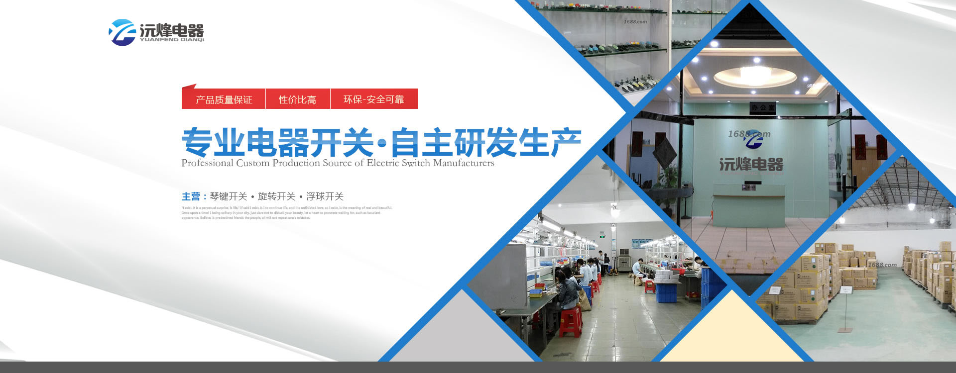 主要生產浮球開關、接近開關、琴鍵開關、旋轉開關、微動開關、船型開關、拉線開關以及接線座等系列產品。